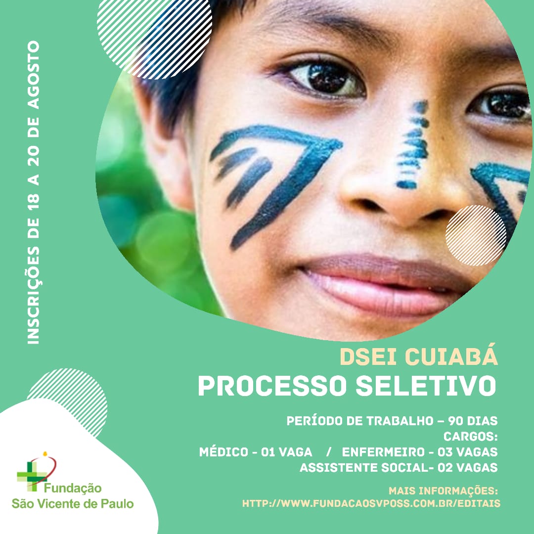 Estão abertas a partir desta terça-feira,18, até o dia 20 de maio, as inscrições do Processo Seletivo (PSS 004/2020) do Distrito Sanitário Especial Indígena (DSEI) Cuiabá (MT) para a contratação de profissionais que farão parte das Equipes Multidisciplinares de Saúde Indígena (EMSI) do DSEI por um período de 90 dias.