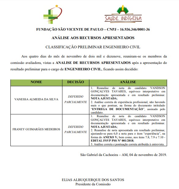 A Fundação São Vicente de Paulo (Paraopeba/MG) realizou a etapa de entrevista com os candidatos ao cargo de Engenheiro Civil no Processo Seletivo Simplificado (PSS) realizado em dezembro de 2018 no Distrito Sanitário Especial Indígena de Alto Rio Negro (DSEI/ ARN) localizado em São Gabriel da Cachoeira na Amazônia.