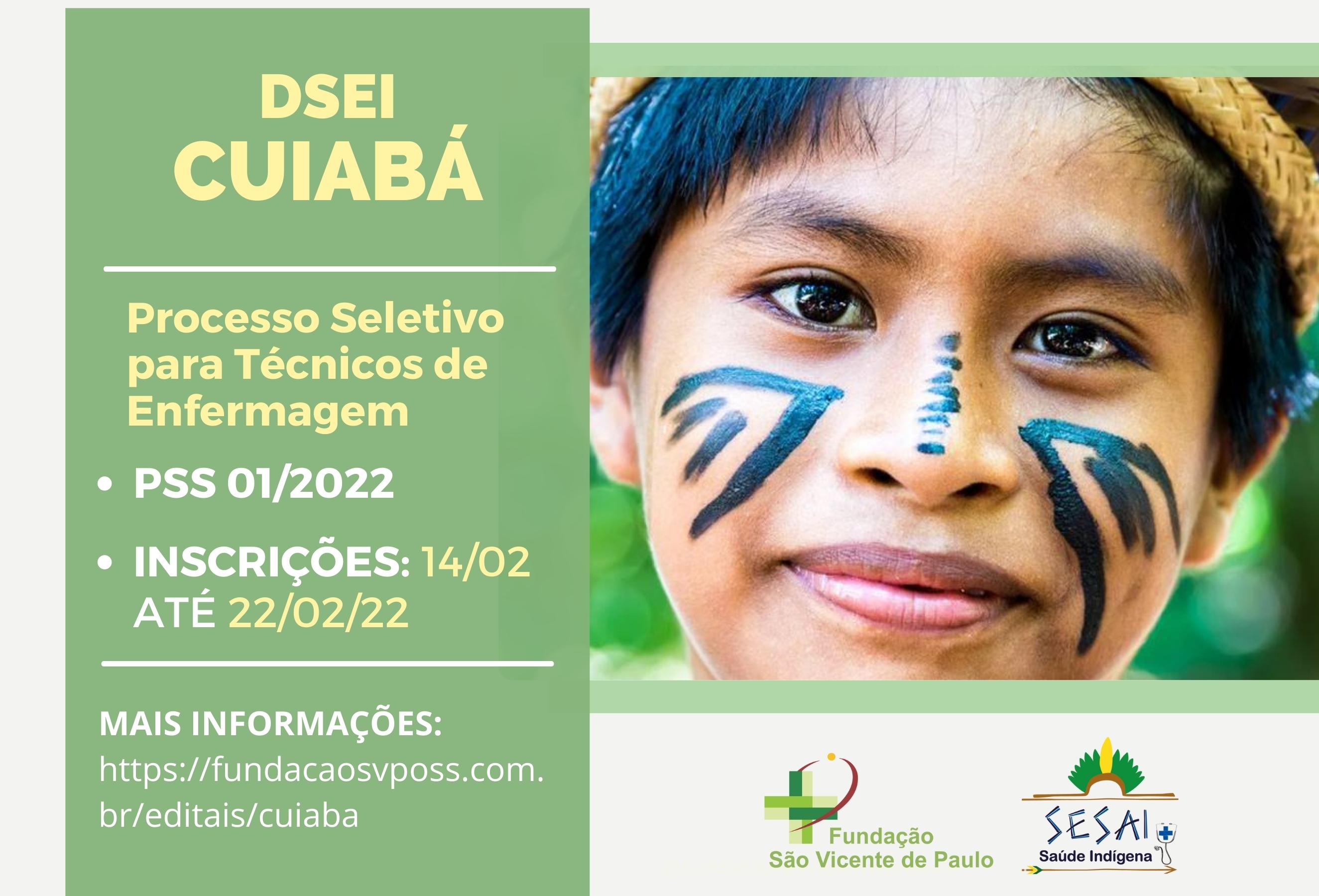 A Fundação São Vicente de Paulo (FSVP) de Paraopeba (MG) deu início nesta segunda-feira, 14, às inscrições do Processo Seletivo Simplificado que irá selecionar Técnicos de Enfermagem para atuarem nas Equipes Multidisciplinares de Saúde Indígena (EMSI) do Distrito Sanitário Especial Indígena (DSEI) Cuiabá (MT). Os interessados poderão realizar suas inscrições até o dia 22/02/2022 por meio do envio do currículo para o endereço eletrônico: fundacao2021seletivo@gmail.com . Além do currículo, é necessário preencher um formulário de inscrição disponível no Edital. Não haverá qualquer recolhimento de taxa.
