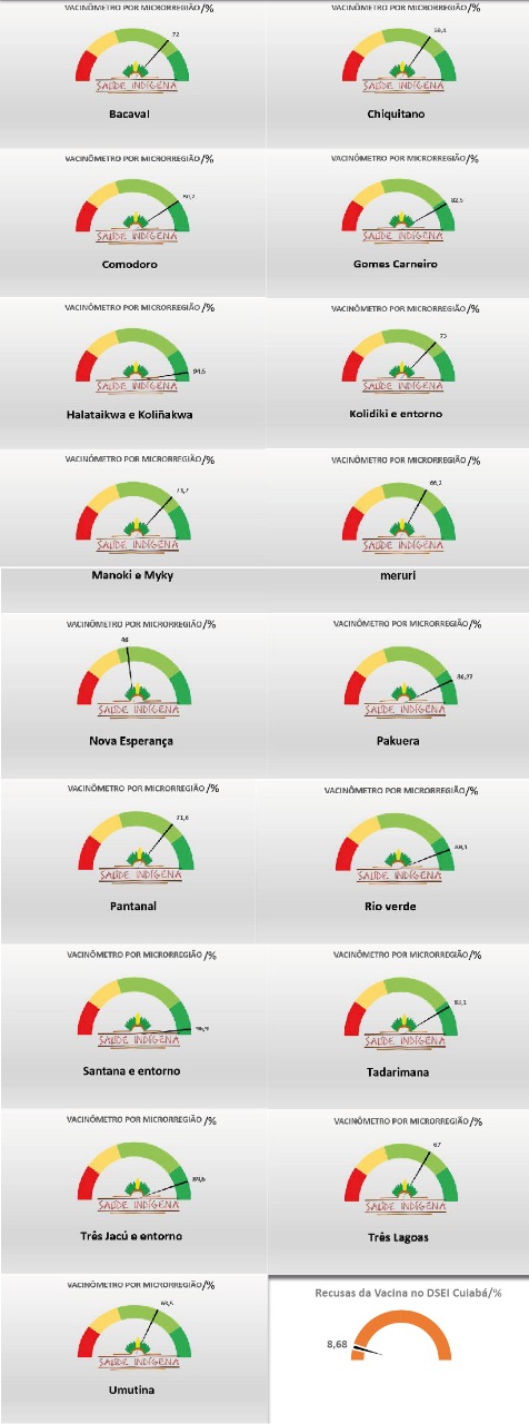 No Distrito Sanitário Especial Indígena (DSEI) Cuiabá, 72,37% dos indígenas já tomaram a primeira dose da vacina contra a COVID-19. As informações são da Coordenação do Distrito que afirma ainda, que apenas 8% rejeitaram a vacina por questões religiosas ou de notícias falsas (fake News).