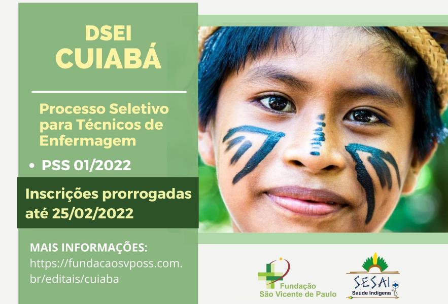 Foram prorrogadas até a próxima sexta-feira, 25/02, as inscrições do Processo Seletivo Simplificado que irá selecionar Técnicos de Enfermagem para atuarem nas Equipes Multidisciplinares de Saúde Indígena (EMSI) do Distrito Sanitário Especial Indígena (DSEI) Cuiabá (MT). Os interessados deverão enviar o currículo e o formulário de inscrição devidamente preenchido conforme o Edital para o endereço eletrônico: fundacao2021seletivo@gmail.com . Não haverá qualquer recolhimento de taxa.