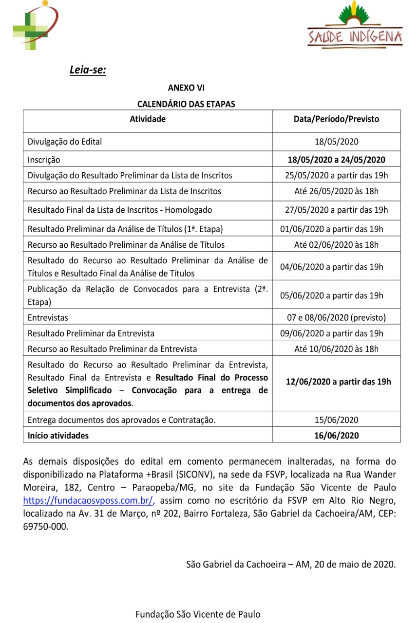 Em virtude da necessidade de uma maior celeridade na finalização de processos seletivos e efetiva contratação de profissionais de saúde para atuarem junto aos Distritos Sanitários Especiais Indígenas, a Fundação São Vicente de Paulo, no uso de suas atribuições, RETIFICA o Edital nº EDITAL FSVP PSS Nº 003/2020 que se refere ao Processo Seletivo Simplificado do DSEI de Alto Rio Negro para o preenchimento das vagas existentes de nível superior, médio e técnico e formação de cadastro de reserva, conforme Plano de Trabalho do Convênio nº. 878439.