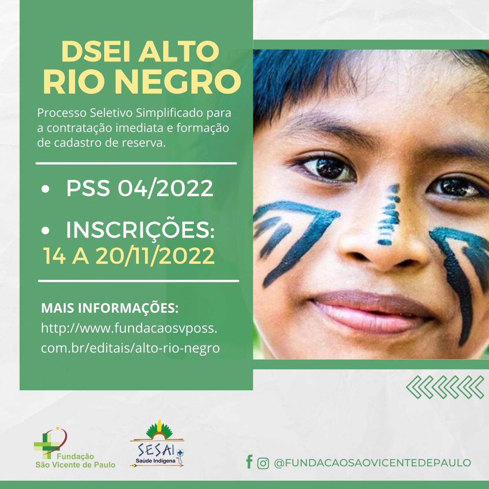 A Fundação São Vicente de Paulo (FSVP), de Paraopeba (MG), inicia nesta segunda-feira, 14, o Processo Seletivo Simplificado (PSS) que visa a contratação Técnico de Saneamento/Edificações/Química e Auxiliar em Saúde Bucal, para atuar em São Gabriel da Cachoeira, podendo haver remanejamento para os municípios de Santa Isabel do Rio Negro e Barcelos afim de atenderem as necessidades do Distrito Sanitário Especial Indígena (DSEI), Alto Rio Negro (ARN).
