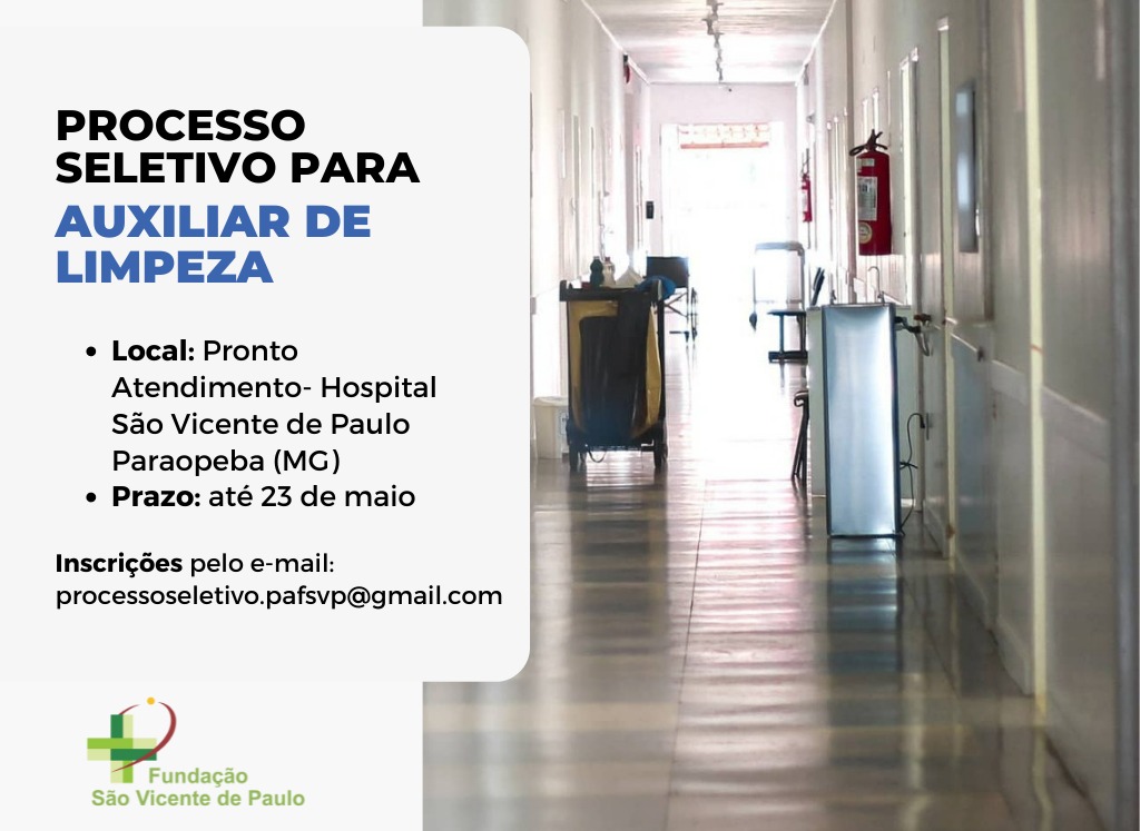 A Fundação São Vicente de Paulo (FSVP), de Paraopeba (MG), deu início nesta quinta-feira, 12, ao processo seletivo para contratação imediata e formação de cadastro reserva para Auxiliar de Limpeza. Com carga horária diferenciada, os profissionais selecionados irão trabalhar no Pronto-Atendimento do Hospital São Vicente de Paulo.