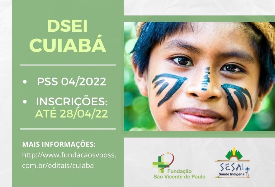Conveniada da Secretaria Especial de Saúde Indígena (Sesai), a Fundação São Vicente de Paulo (FSVP) Paraopeba (MG), iniciou nesta segunda-feira, 18, e segue até o dia 28 de abril, o processo seletivo simplificado do Distrito Sanitário Especial Indígena (DSEI), Cuiabá, para a Contratação de Pessoal e Formação de Cadastro no âmbito da Saúde Indígena.